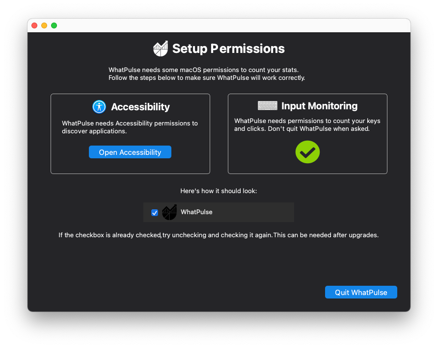 To operate within macOS, the client needs system permissions. To be precise, it needs Accessibility and Input Monitoring permissions. Previously, a not-so-smart popup told you that the permissions weren’t set up correctly. Now, it’ll guide you through the process: